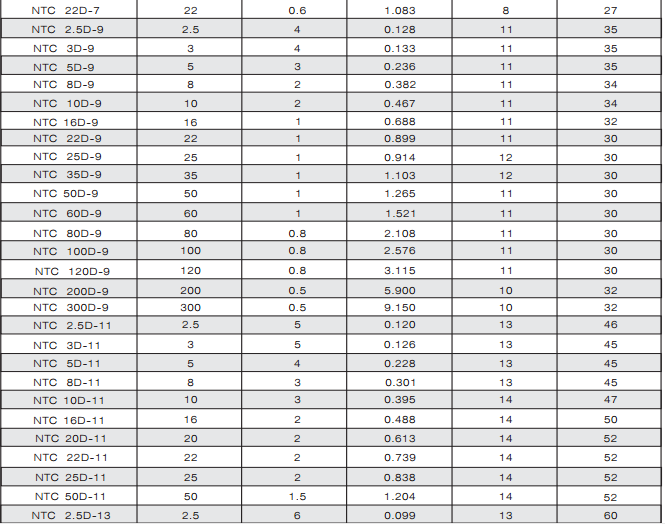 NTC熱敏電阻器:是以錳、鈷、鎳和銅等金屬氧化物為主要材料,采用陶瓷工藝制造而成的。NTC熱敏電阻器在室溫下的變化范圍在10°歐姆~10⒍歐姆,溫度系數(shù)-2%~-6.5%。它具有電阻值隨溫度的上升而下降的特性。適用于轉(zhuǎn)換電源、開關(guān)電源、UPS電源、各類電加熱器、電子節(jié)能燈、電子鎮(zhèn)流器、各種電子裝置電源電路的保護(hù)以及彩色顯示管、白熾燈及其他照明燈具的燈絲保護(hù)。