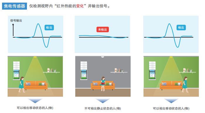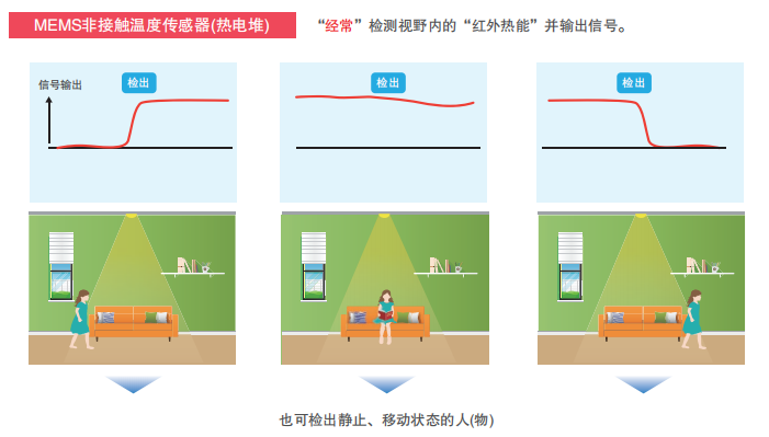 焦電傳感器和MEMS非接觸溫度傳感器都是接收紅外線微弱的熱能并輸出信號(hào)的傳感器。焦電傳感器無(wú)法檢測(cè)靜止?fàn)顟B(tài)的人(物),而MEMS非接觸溫度傳感器可以檢測(cè)靜止?fàn)顟B(tài)的人(物)。
