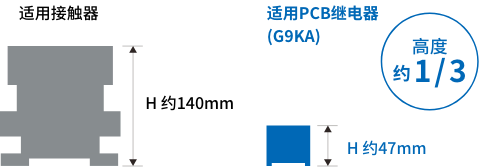為了解決這個發(fā)熱課題而開發(fā)的產(chǎn)品便是G9KA型高容量功率繼電器。G9KA在行業(yè)內(nèi)實(shí)現(xiàn)低接觸電阻0.2mΩ,有效抑制了作為小型化、高容量化重大課題的發(fā)熱。此外,與同等電流容量的接觸器相比,高度采用只有其1/3左右的緊湊型尺寸,有助于實(shí)現(xiàn)設(shè)備的小型化、省空間化。