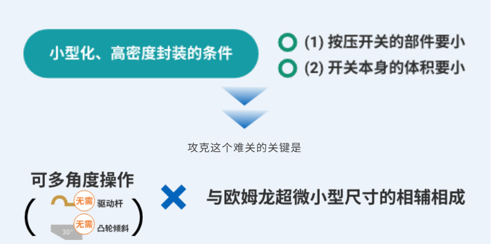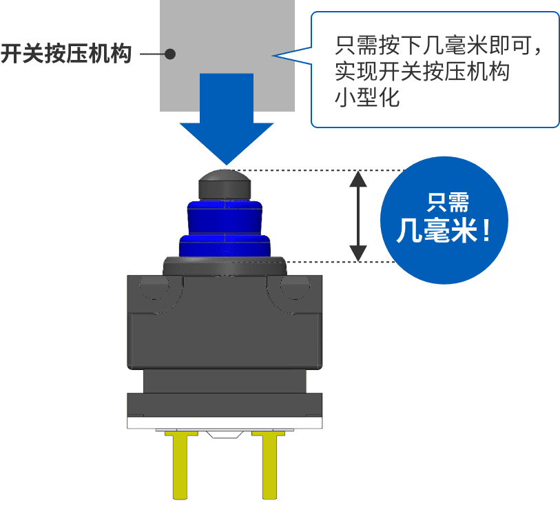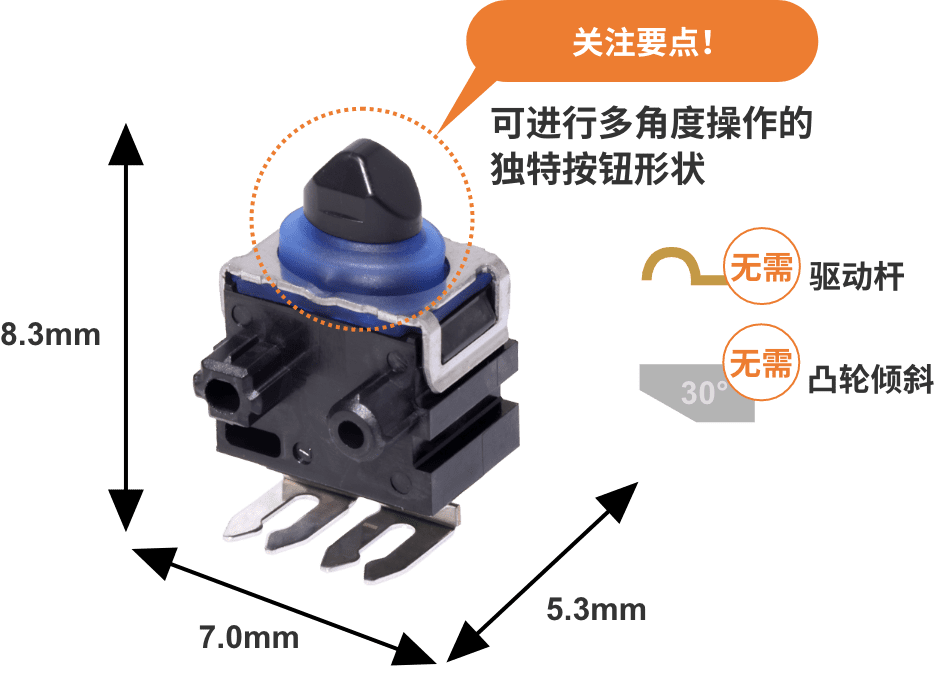 實(shí)現(xiàn)(1)和(2)最簡單的方法就是從正上方按壓,也就是從行程(完全按下開關(guān)的距離)最短的角度按壓。但要設(shè)計(jì)行程只有幾毫米的超微小型開關(guān)的垂直按壓并不容易。