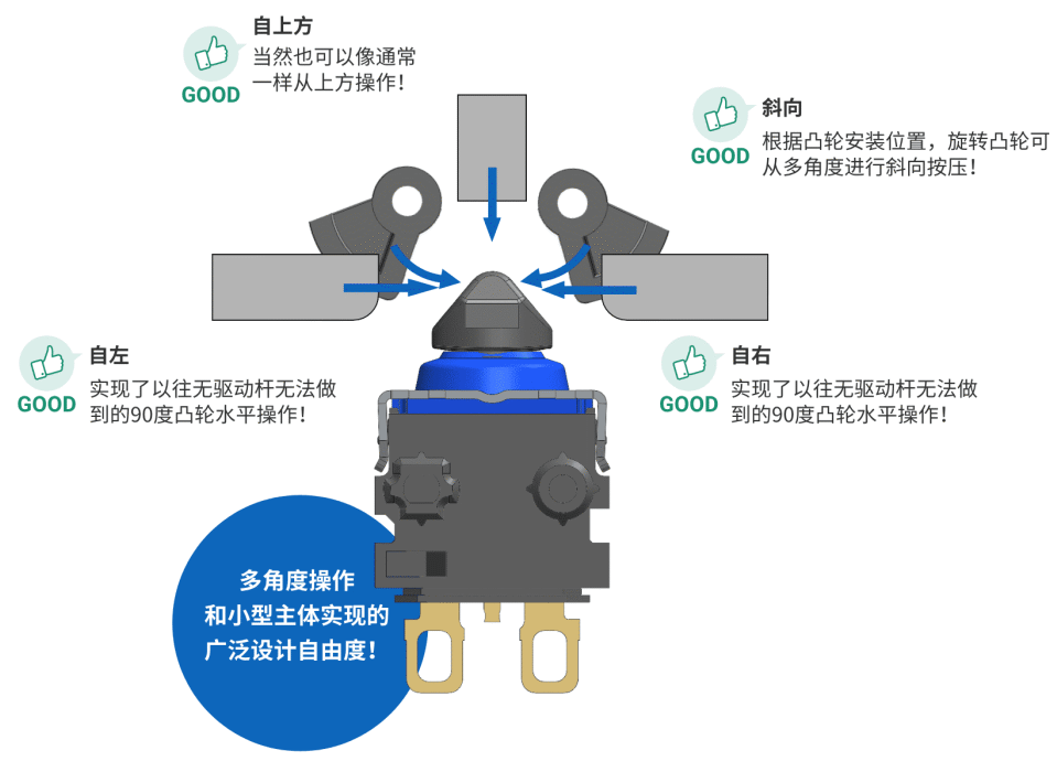 D2EW開關(guān)通過歐姆龍全新研發(fā)的獨(dú)特按鈕形狀,無需驅(qū)動(dòng)桿、無需傾斜水平凸輪即可從水平方向進(jìn)行操作。除了水平方向,還可從其他角度進(jìn)行操作。(參照下圖)