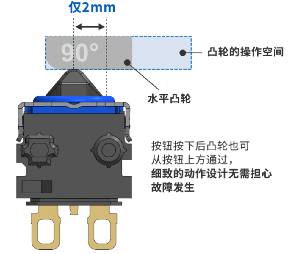 由于無驅(qū)動(dòng)桿,水平凸輪只需最小的移動(dòng)即可完全按下按鈕,因此有助于節(jié)省空間。