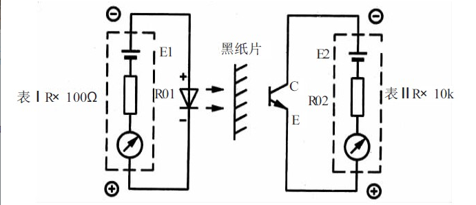 采用“雙表法”檢查光電開關(guān)的電路如圖2 所示。為避免外界光線的影響,應盡量在暗處檢測光電開關(guān)。具體方法是:將表Ⅰ撥至R×100 Ω 檔向發(fā)射管提供正向電壓,表Ⅱ置于R×10 kΩ 檔測量c-e 極間電阻。把黑紙片放在發(fā)射窗與接收窗中間,用來阻擋紅外線。上、下抽動紙片時應觀察到表Ⅱ指針有明顯的擺動。在測試條件不變的情況下,指針擺幅愈大,說明器件的靈敏度愈高。
