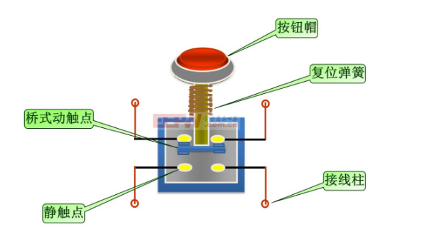 按鈕一般由按鈕帽、復位彈簧、橋式動觸頭、靜觸頭、支柱連桿及外殼等部分組成。
