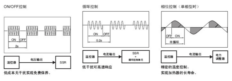 控制、循環(huán)控制、 相位控制) ON/OFF控制接受溫控器的電壓輸出信 號(hào), 通過(guò)開關(guān)SSR來(lái)控制加熱器的 ON/OFF。在電磁繼電器中也可進(jìn)行相同 的控制, 但是以數(shù)秒間隔控制ON/OFF, 使用數(shù)年時(shí)需要SSR。 循環(huán)控制(G32A-EA) 以0.2秒(固定) 為 控制周期。其方式是使其在0.2秒內(nèi) ON/OFF, 從而控制輸出電力。 接受溫控器的電流輸出4~20mA來(lái)控制。