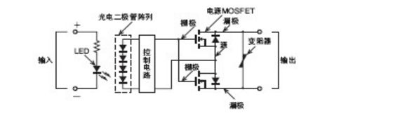 MOS FET繼電器是在輸出元件中使用功率MOS FET的SSR。為使功率MOS FET動(dòng)作, 光電二極管陣列作為受光元件使用。輸入端子中有電流流過(guò)時(shí), LED會(huì)發(fā)光。這個(gè)光使光電二極管陣列中發(fā)生光電流, 這使柵極電壓使功率MOS FET置于ON。用源共通連接2個(gè)功率MOS FET, 可控制AC負(fù)載。DC專用的類型中有帶1個(gè)電源 MOS FET的類型。