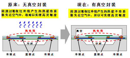 這次,世界首次成功將熱電堆真空封裝在芯片內(nèi)。采用真空封裝即可避免將熱電堆轉(zhuǎn)換的熱能散失在空氣中,使金屬接點之間的溫差變大,從而可實現(xiàn)更高的靈敏度。