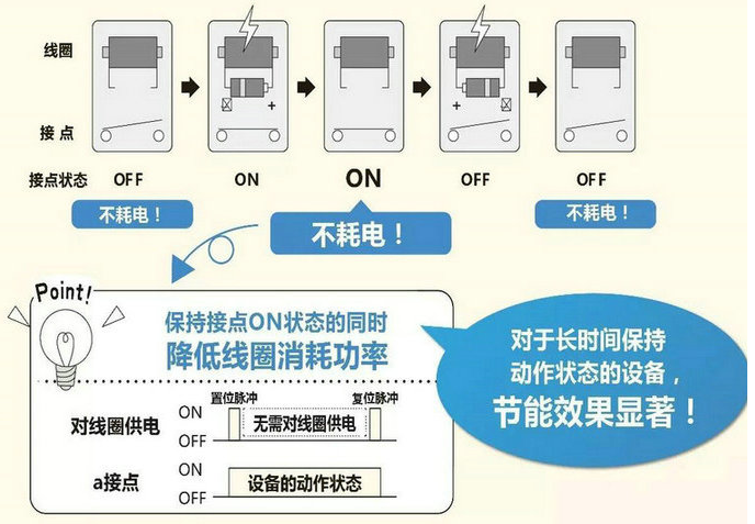 鎖定功能:在施加線圈電壓時(shí)將接點(diǎn)置ON或OFF即使斷開線圈電壓依然保持該狀態(tài)的功能。在設(shè)備的動(dòng)作狀態(tài)下降低線圈消耗功率,為節(jié)能作出貢獻(xiàn)。