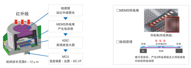 MEMS非接觸溫度傳感器(紅外傳感器)是由熱電堆元件接收來自對(duì)象物的紅外熱能,從而以非接觸方式檢測對(duì)象物表面溫度的傳感器。