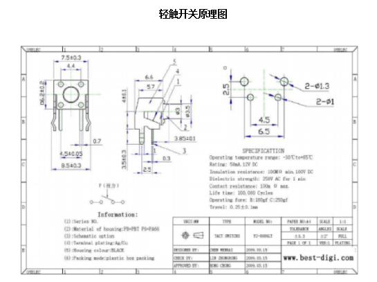 挑選輕觸開關(guān)方法四:壽命和手感是輕觸開關(guān)的行程和彈片的配合決定的,行程越短聲音越輕壽命越長(zhǎng),行程越長(zhǎng)則反之,在固定的彈片工藝情況下,主要看行程或聲音決定輕觸開關(guān)的壽命; 另外,決定彈片壽命的關(guān)鍵因素還是沖壓技術(shù)。