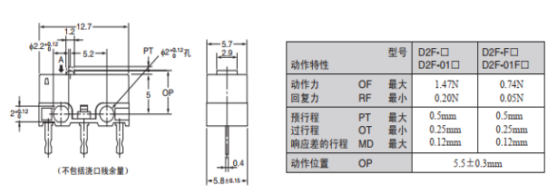 歐姆龍微動開關(guān)D2F-F的優(yōu)勢:超小型,性能穩(wěn)定,動作力只需要0.74N,能夠更精準地感應剎車片磨損的程度,為風力發(fā)電機的安全運作提供給更有力的保障,以下是D2F-F的尺寸圖和動作特性。