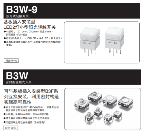 首先來聊聊什么商用飲水機上可以用我們歐姆龍的哪些產品,這里小編給大家推薦可以應用在飲水機上面歐姆龍的輕觸開關,B3W防水系列和B3W-9帶燈的系列,都可應用。