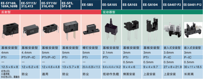 例如在打印機(jī)、智能設(shè)備、工業(yè)機(jī)械等設(shè)備上可以使用EE-SX1088,EE-SX1041,EE-SF5和EE-SX1081,這幾款小體積槽型和對射式光電開關(guān),驅(qū)動(dòng)功耗低、靈敏度高,輸出電流高低,超小的超寬。