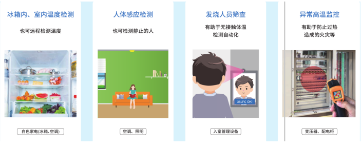 物體檢測:可以針對對象物進行定點精確檢測,無需接觸即可測量對象物的溫度,適用于工業(yè)設(shè)備,非接觸溫度計,冰箱,微波爐,電磁烹飪爐,等領(lǐng)域。