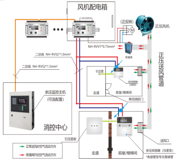 2, 余壓監(jiān)控系統(tǒng)通過余壓探測器實(shí)時監(jiān)測余壓值(前室/走道或樓梯間/走道氣壓差值), 當(dāng)余壓值超過報警設(shè)定值(前室30Pa, 樓梯間50Pa),余壓探測器將發(fā)出報警信號,同時聯(lián)動余壓控制器控制旁通閥開啟,減少正壓風(fēng)機(jī)前室或樓梯間的送風(fēng)量,降低前室或樓梯間余壓值。