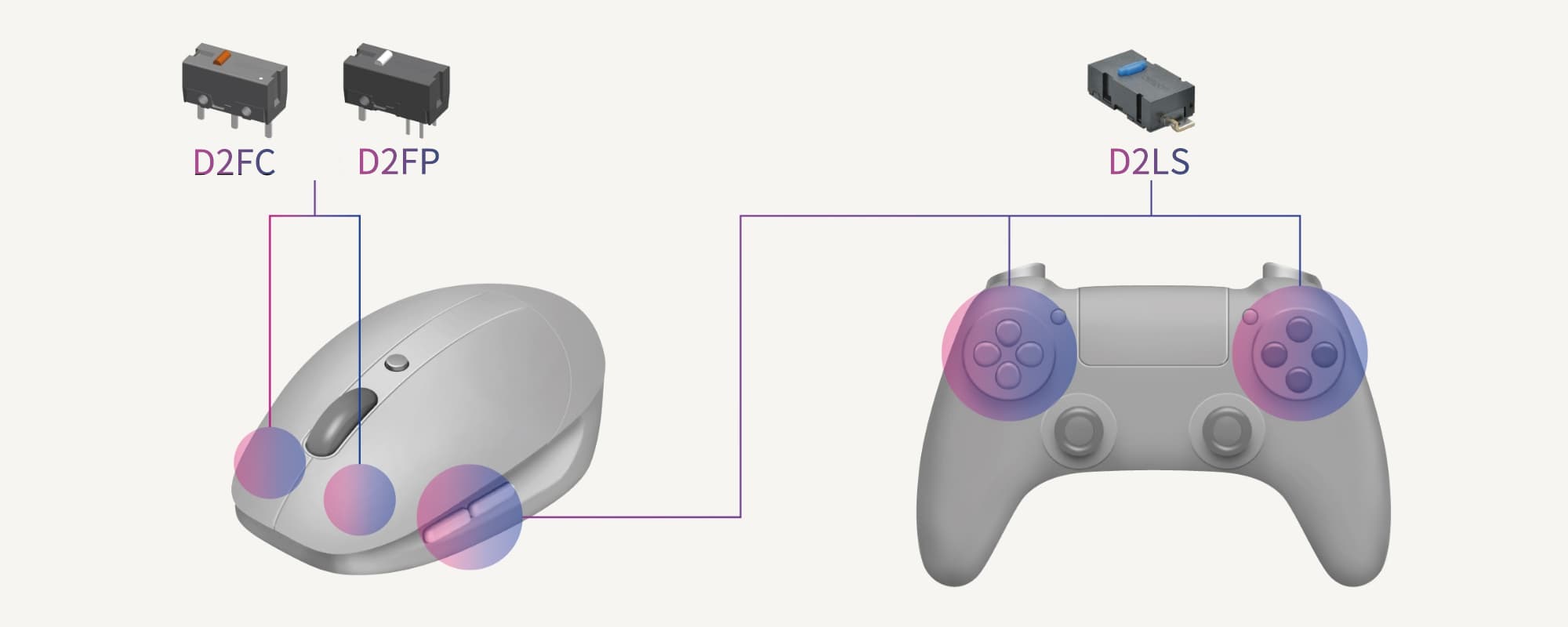 微動(dòng)開(kāi)關(guān)是具有微小接點(diǎn)間隔和速動(dòng)機(jī)構(gòu),用規(guī)定的行程和力度進(jìn)行開(kāi)關(guān)動(dòng)作的一種微小型開(kāi)關(guān)。在最開(kāi)始,歐姆龍并沒(méi)有生產(chǎn)鼠標(biāo)專(zhuān)用微動(dòng)開(kāi)關(guān)的想法,而契機(jī)來(lái)源于一家鼠標(biāo)廠商,他們非常喜歡歐姆龍微動(dòng)開(kāi)關(guān)D2F系列的操作感和輕觸感,作為日常使用頻率極高的的鼠標(biāo),具有“后行程”功能的D2F型可從推入位置繼續(xù)推入,對(duì)手指產(chǎn)生的負(fù)擔(dān)微小。于是便于手指操作且尺寸較小的D2F系列開(kāi)關(guān)正巧成為了一款可滿(mǎn)足鼠標(biāo)開(kāi)關(guān)需求的商品。