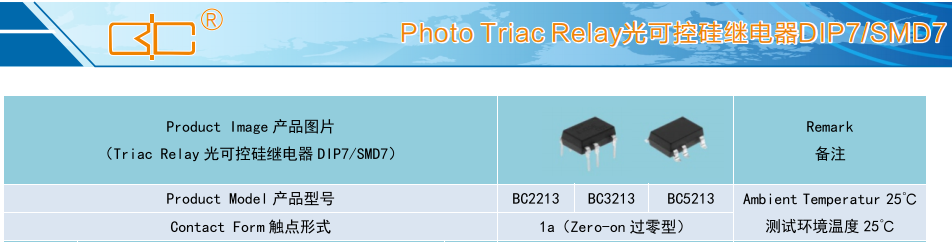 (Triac Relay 光可控硅繼電器 DIP7/SMD7),Product Model產(chǎn)品型號:BC2213/BC3213/BC5213,Contact Form觸點形式:1a(Zero-on 過零型),Ambient Temperatur 25'C,測試環(huán)境溫度 25℃℃