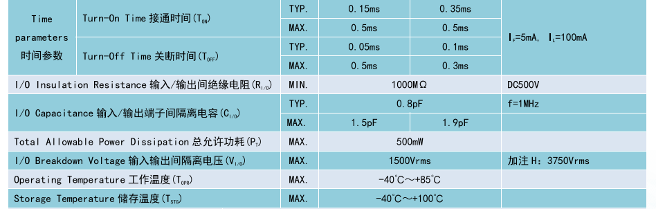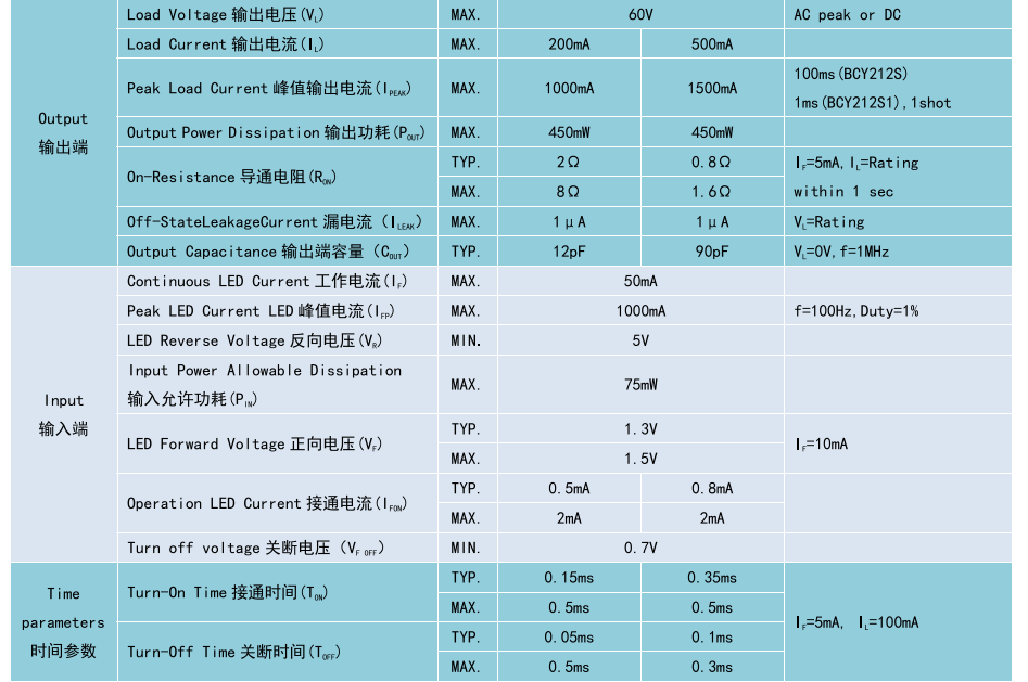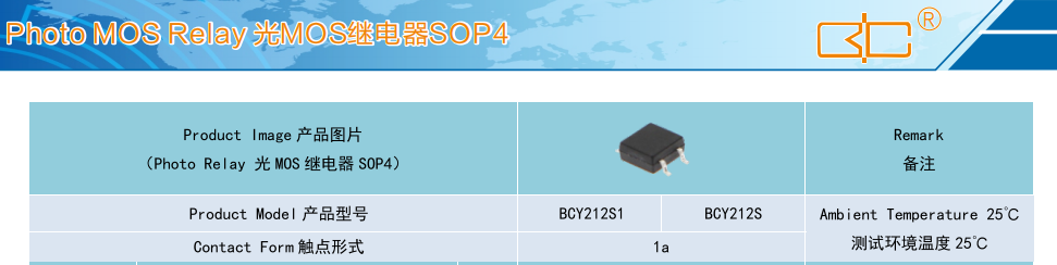 (Relay 光 MOS 繼電器 SOP4),Product Model產(chǎn)品型號:BCY212S1、BCY212S,Contact Form觸點(diǎn)形式:1a,Ambient Temperature 25'C,測試環(huán)境溫度 25℃