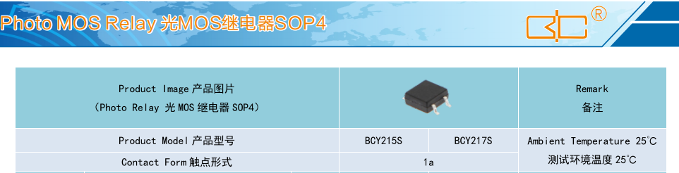 (Relay 光MOS 繼電器 SOP4),Product Model產(chǎn)品型號:BCY215S、BCY217S,Contact Form 觸點形式:1a,Ambient Temperature 25'C,測試環(huán)境溫度 25°℃