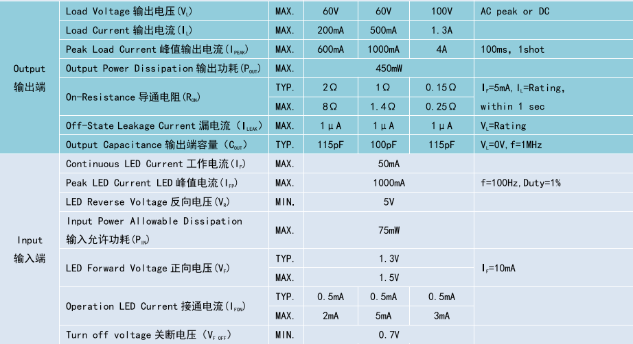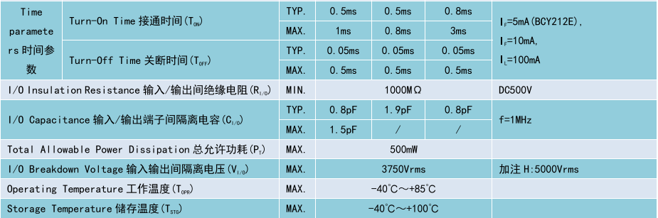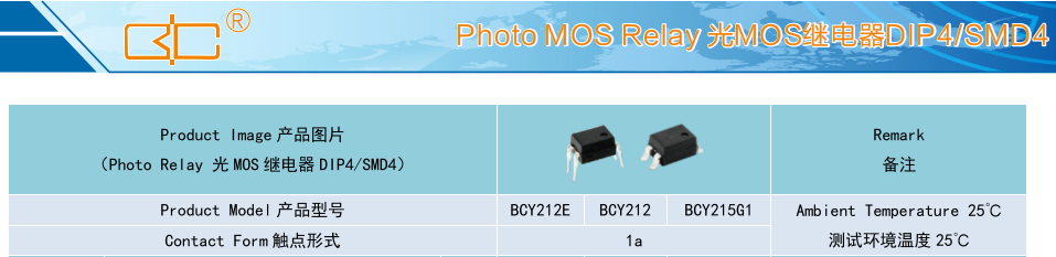 (Relay 光 MOS 繼電器 DIP4/SMD4),Product Model產(chǎn)品型號(hào):BCY212E/BCY212/BCY215G1,Contact Form觸點(diǎn)形式:1a,Ambient Temperature 25C,測試環(huán)境溫度 25℃