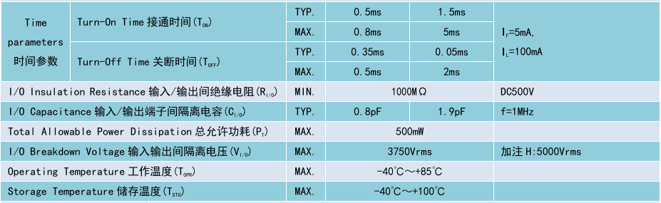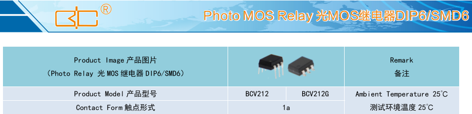 (Relay 光 MOS 繼電器 DIP6/SMD6),Product Model產(chǎn)品型號:BCV212/BCV212G,Contact Form 觸點形式:1a,Ambient Temperature 25'C測試環(huán)境溫度 25°C
