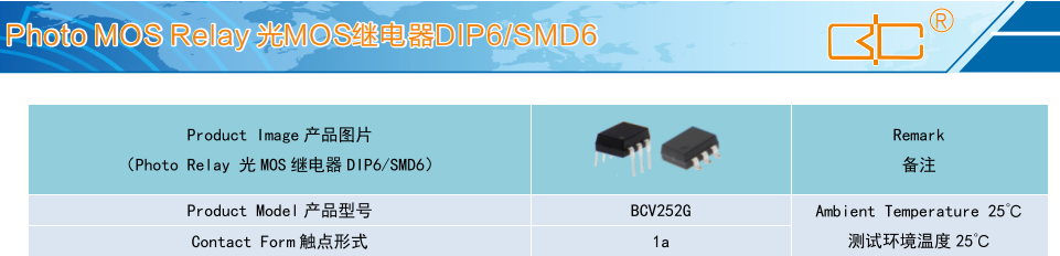 (Relay 光MOS 繼電器 DIP6/SMD6),Product Model產(chǎn)品型號(hào):BCV252G,Contact Form 觸點(diǎn)形式:1a,Ambient Temperature 25C測(cè)試環(huán)境溫度 25°C