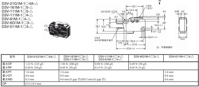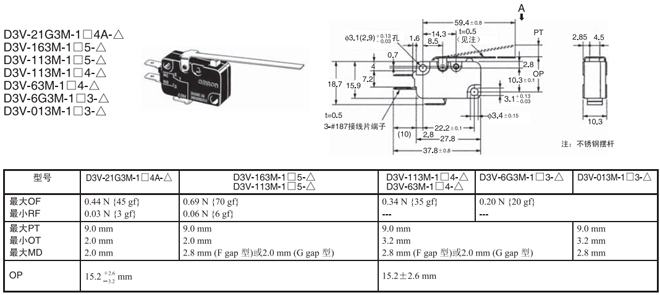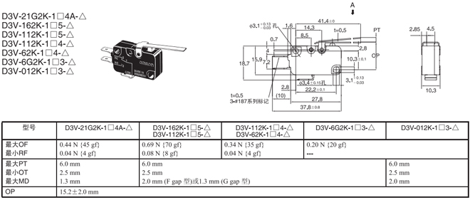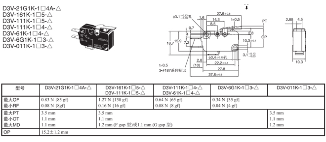 | 針狀按鈕型 | --- | 1.23N {125gf} | D3V-21G-1□4A-△ | D3V-21G-2□4A-△ | D3V-21G-3□4A-△ |