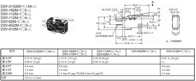 | 長(zhǎng)擺桿型 | 內(nèi)部安裝 | 0.44N {45gf} | D3V-21G3-1□4A-△ | D3V-21G3-2□4A-△ | D3V-21G3-3□4A-△ |