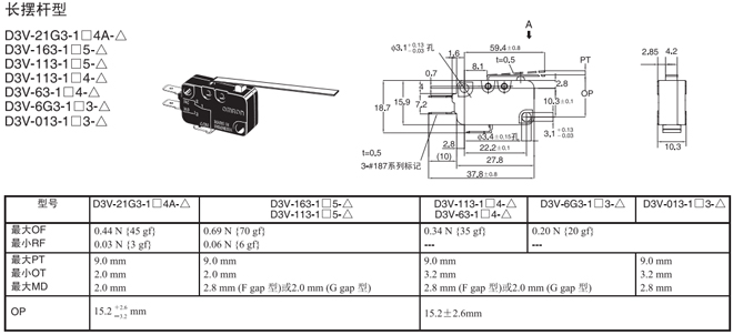 | 長(zhǎng)擺桿型 | 內(nèi)部安裝 | 0.69N {70gf} | D3V-163-1□5-△ | D3V-163-2□5-△ | D3V-163-3□5-△ |