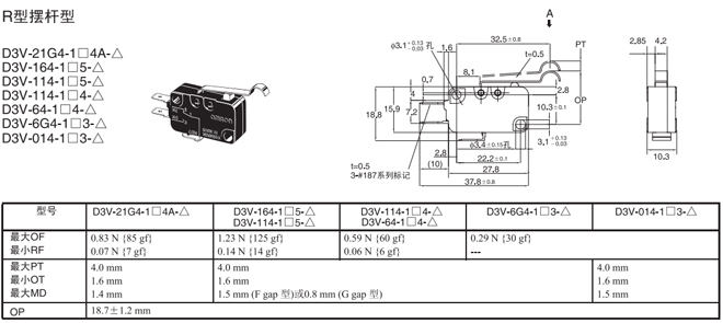 | R型擺桿型 | 內(nèi)部安裝 | 0.83N {85gf} | D3V-21G4-1□4A-△ | D3V-21G4-2□4A-△ | D3V-21G4-3□4A-△ |