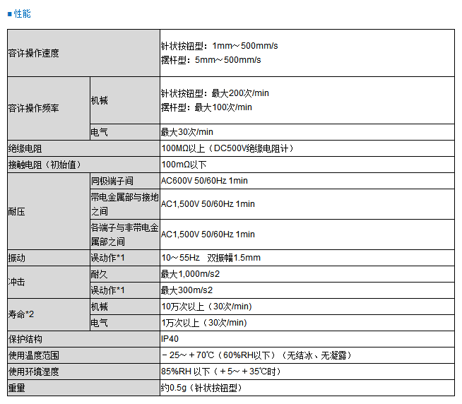 ? ??*1 在針狀按鈕型中為自由位置和動(dòng)作極限位置的值,在擺桿型中為動(dòng)作極限位置的值。接點(diǎn)的閉路或開路動(dòng)作小于1ms。 ? ??*2 關(guān)于試驗(yàn)條件請另行查詢。