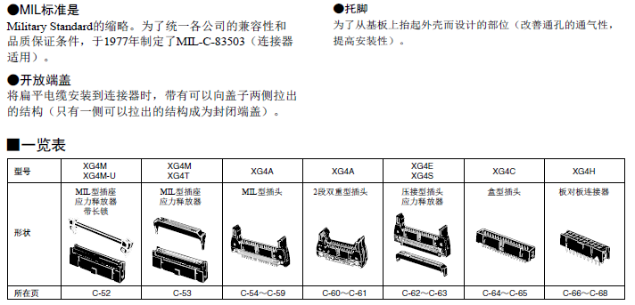 印刷基板連接器的核心、MIL規(guī)格標準品 通過采用新型生產(chǎn)力設(shè)計,高可靠性與低價格的同步實現(xiàn)。 備有便于省空間封裝的盒型插頭(XG4C)。 同時具有可進行中繼使用的壓接型插頭(XG4E)。 將本公司的散線壓接型連接器(XG5)特有插頭(XG8)與PCB型(XG2)組合使用可實現(xiàn)種類豐富的各種封裝。 適用本公司自己開發(fā)的簡易鎖定擺桿可以使特有插頭(XG8)和盒型插頭(XG4C)也能夠進行鎖定。 MIL規(guī)格(MIL-C-83503)標準。 標準品符合UL規(guī)格(File No. E103202)認證產(chǎn)品。