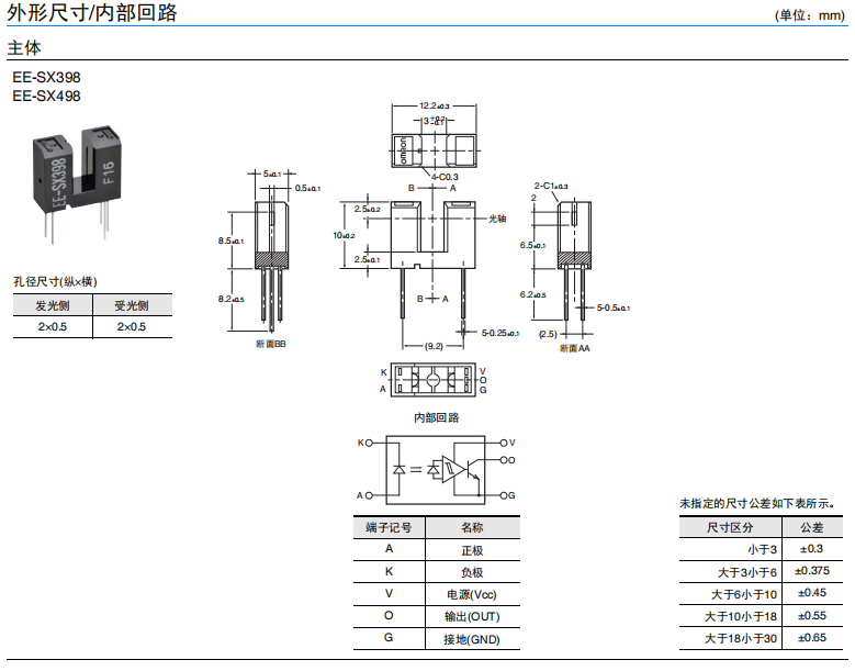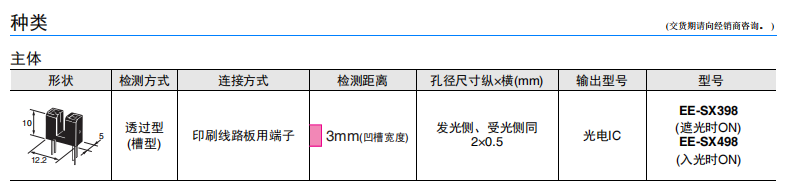 凹槽端子型(槽寬:3mm) ? 光電IC輸出(分為遮光時(shí)ON(EE-SX398)/入光時(shí)ON(EE-SX498) 2種類型) ? 適用電源電壓為DC4.5~16V ? 可直接連接C-MOS