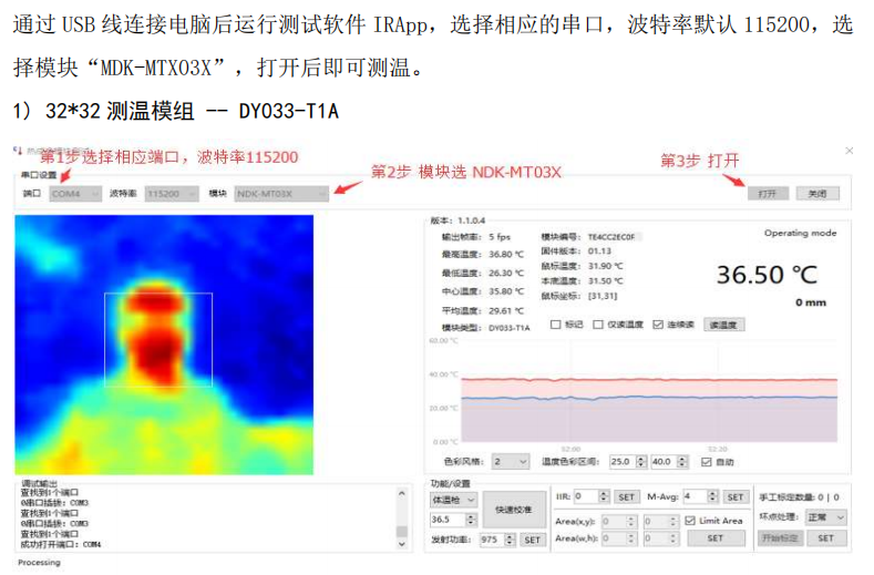采用串口通信協(xié)議,波特率默認(rèn)115200,8數(shù)據(jù)位,1停止位,無校驗(yàn)。其中用戶控制端是主機(jī),測溫模組是從機(jī),采用一發(fā)一收。協(xié)議輸出數(shù)據(jù)有兩種查詢命令方式,一是只查詢?nèi)梭w溫度,二是查詢陣列溫度數(shù)據(jù)。