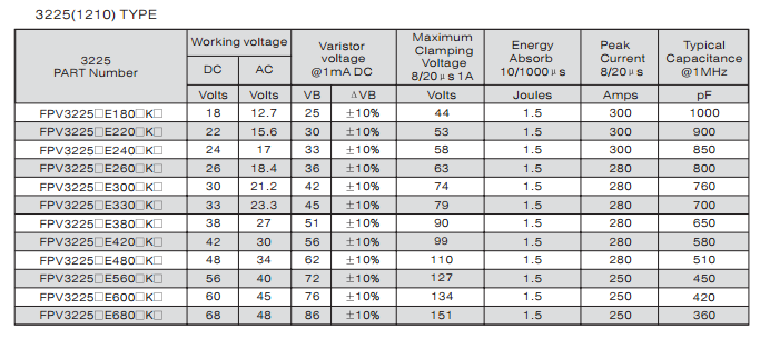 特征: 1、疊層片式陶瓷結(jié)構(gòu)。 2、無(wú)引線。 3、溫度范圍:-55℃~+125 ℃。 4、工作電壓范圍V w(dc)=3.3~ 615V。 5、具有雙向限制特性,適合ESD保護(hù)。 6、漏電流非常小。 7、寄生電感小、響應(yīng)速度快(響應(yīng)時(shí)間少于0.5ns)。 8、優(yōu)良的溫度系數(shù)。 9、良好的焊接性能(端電極為三層電鍍)。 應(yīng)用: 1、防止過(guò)電壓:當(dāng)施加的電壓升高到壓敏電壓時(shí),壓敏電阻器的電流急劇上升,被保護(hù)設(shè)備的浪涌電壓迅速減小,從而使裝有壓敏電阻器的設(shè)備抗浪涌噪聲能力達(dá)到相應(yīng)要求。